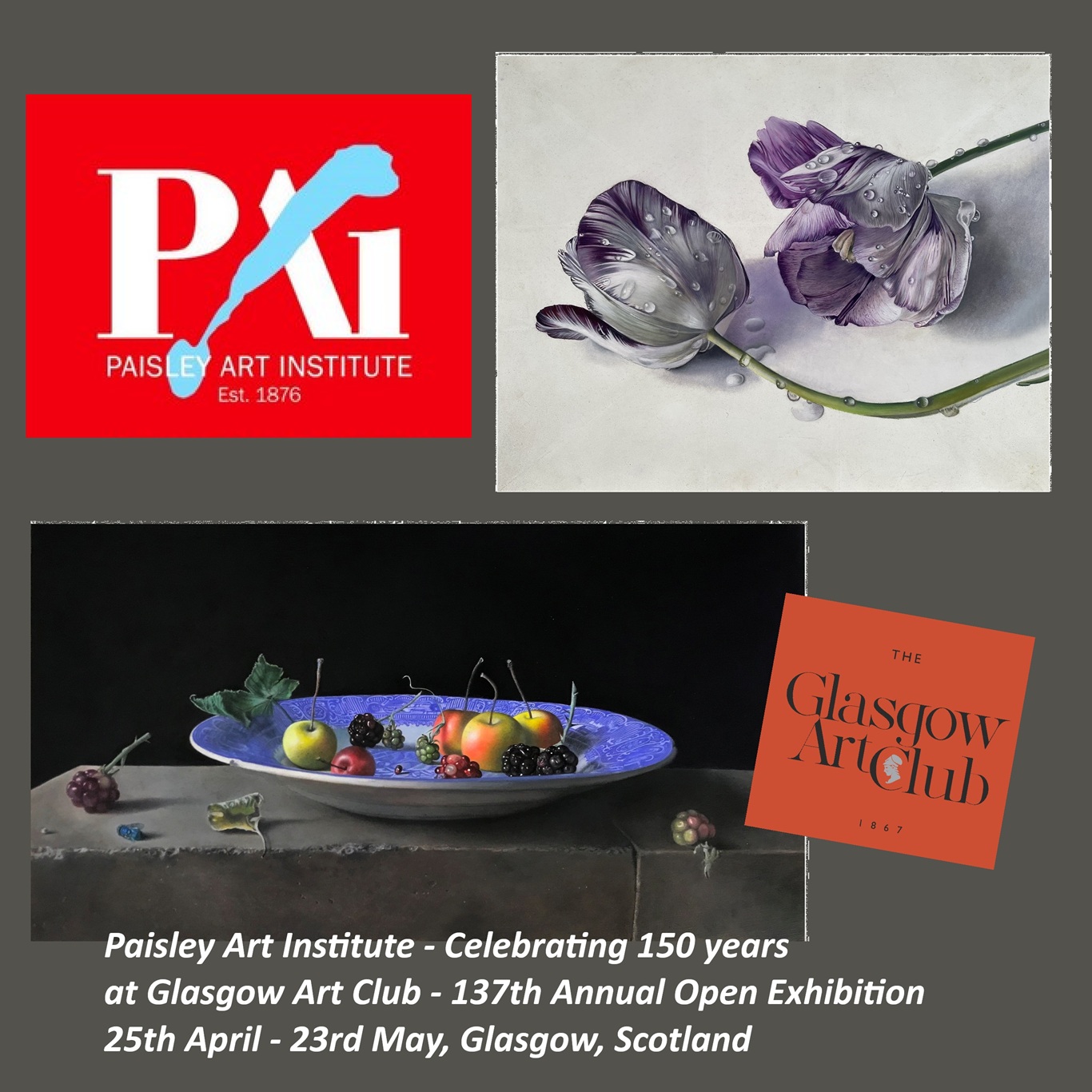 I am so delighted that both my oil paintings, "Broken Tulips" (28x35cm - oil on panel) and "November Harvest" (45x25cm - oil on panel) have been selected for the 150 year celebration of the Paisley Art Institute (PAI) in Scotland!
